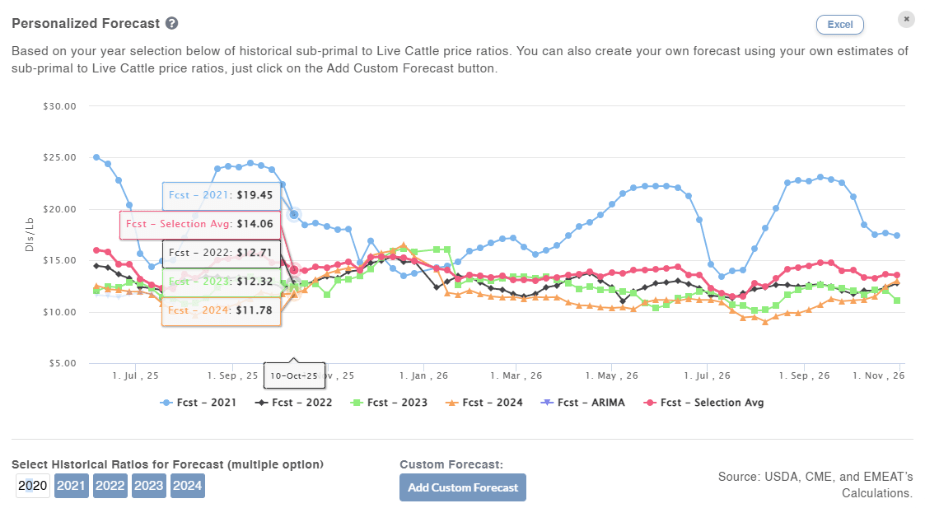 This Forecast combines the historical ratios with the Live Cattle/Lean Hogs Futures curve to produce price estimates for specific sub-primals.