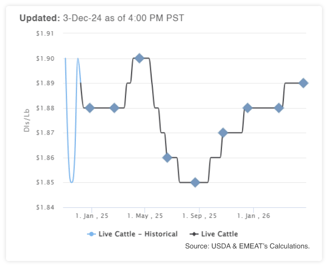 With our short and long-term forecasts based on historical relationships and live cattle/swine futures prices.