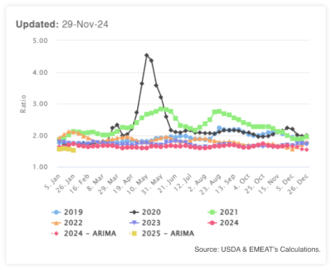 Ratios are calculated by dividing the weekly spot price of the sub-primal by the weekly spot price of live cattle or swine.