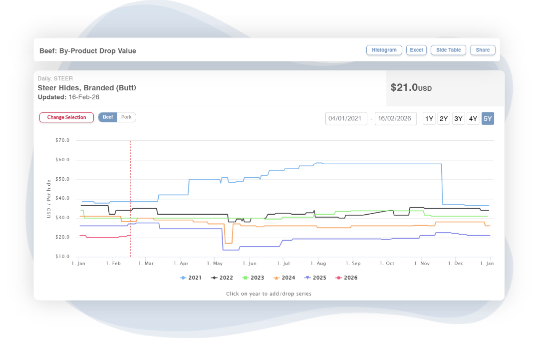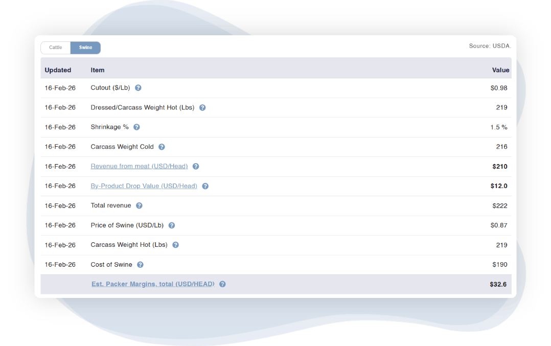 Packer margins are calculated based on current market conditions, delivering a timely view of packer profitability. This suite includes access to the most recent margin tables. Full access only available with the Advanced Analytics suite.