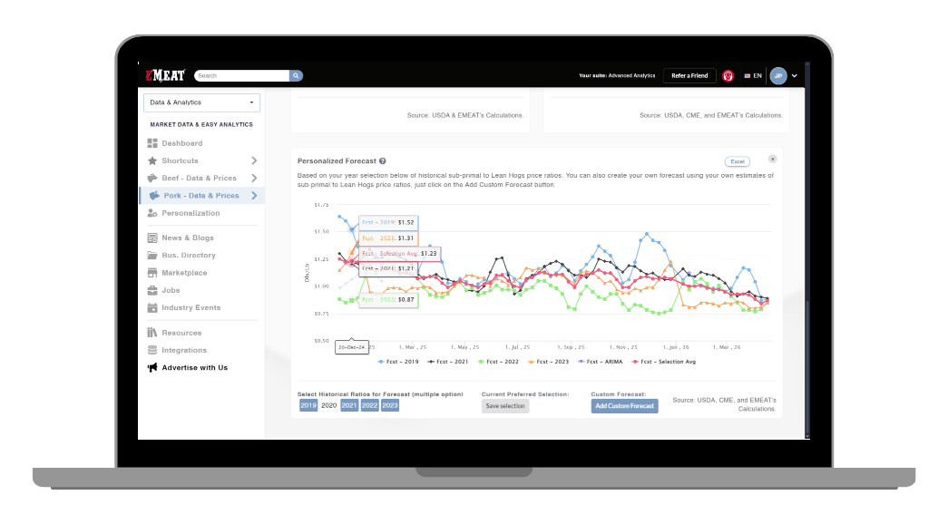 Access powerful and intuitive meat price forecasting tools such as Beef & Pork Price Forecasts and Packer Margins, along with everything included in the Easy Analytics Suite.